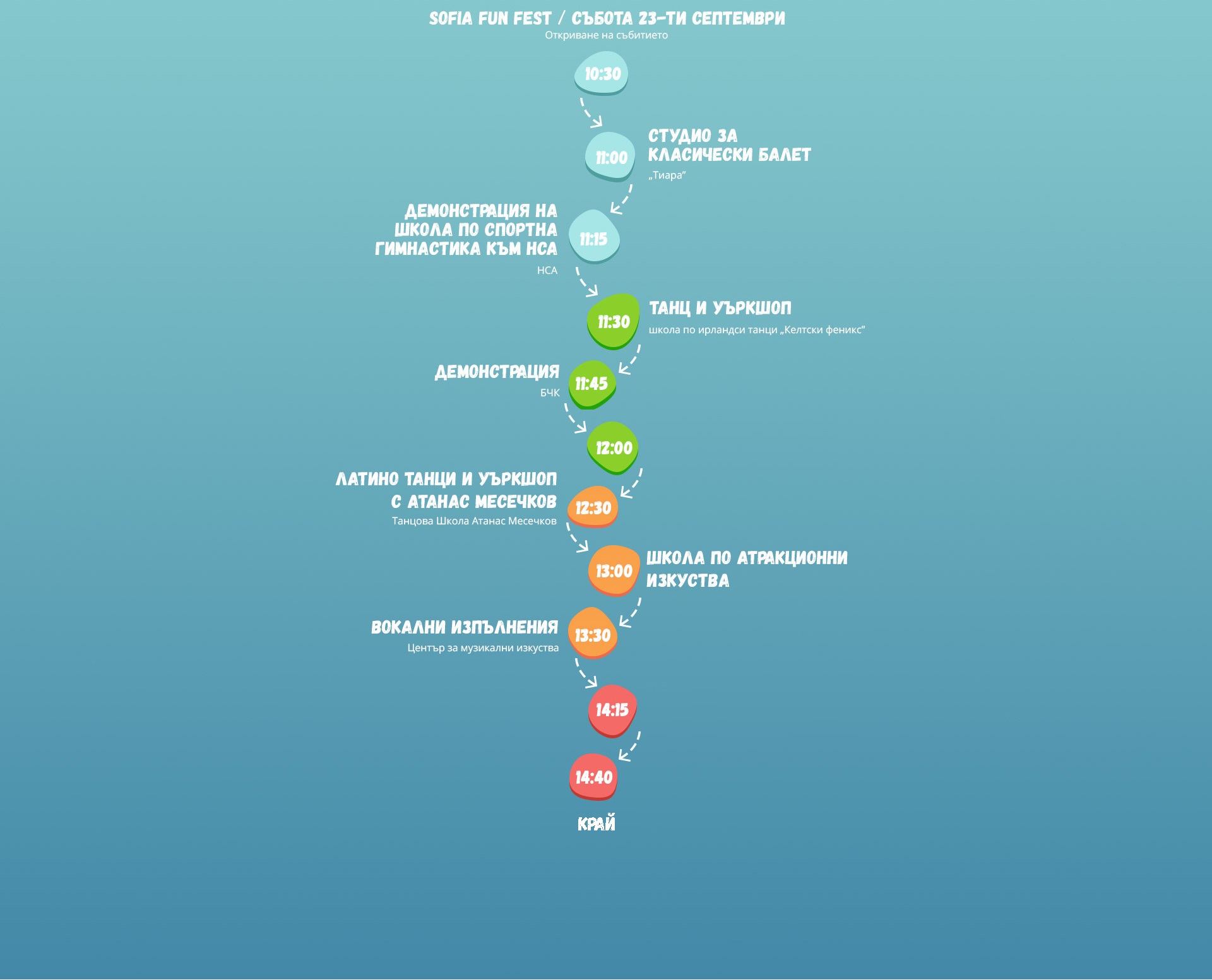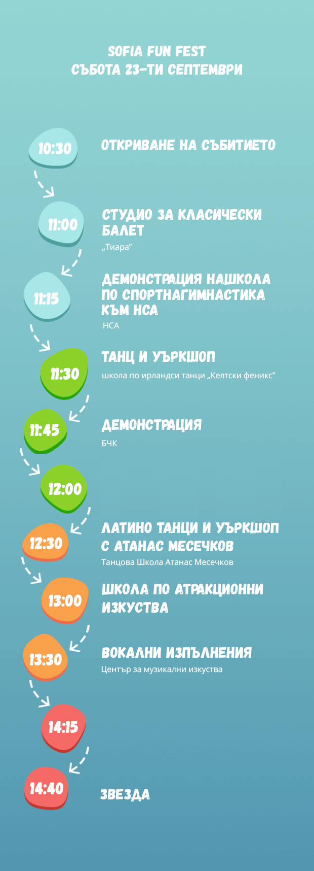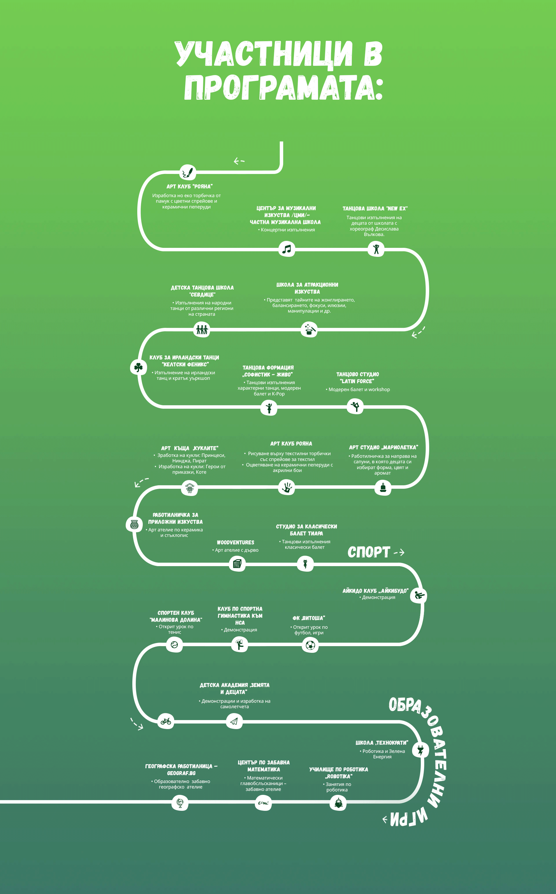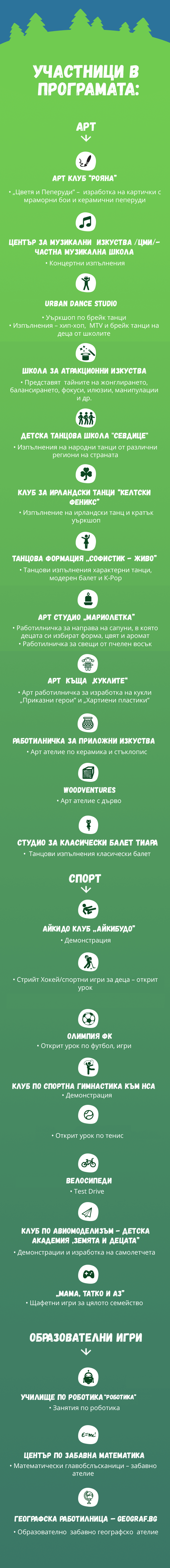 В рамките на двата дни (23 и 24 септември) ще поднесем на децата и родителите им истинско забавление и съвместни занимания. Цялото семейство ще научи повече и ще може да се запознае отблизо със спортовете и изкуствата, от които децата се вълнуват, ще открият нови такива.