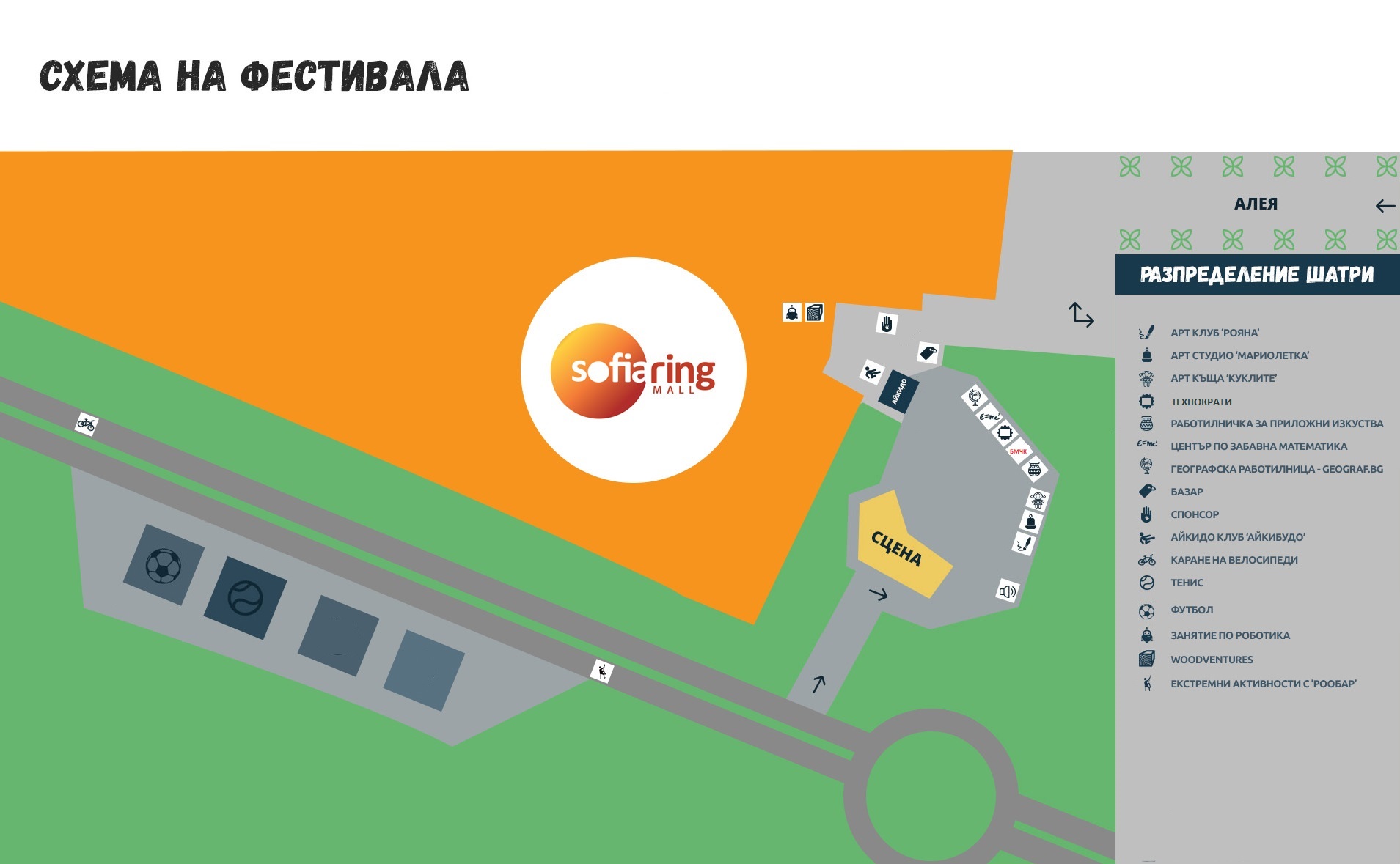 Домакините от Ring Mall ще приютят работилнички от различни форми на изобразителното и приложно изкуство в откритото пространство пред амфитеатралната сцена и ще разгърнат възможности за различни спортни занимания на затворения за целта VIP паркинг.